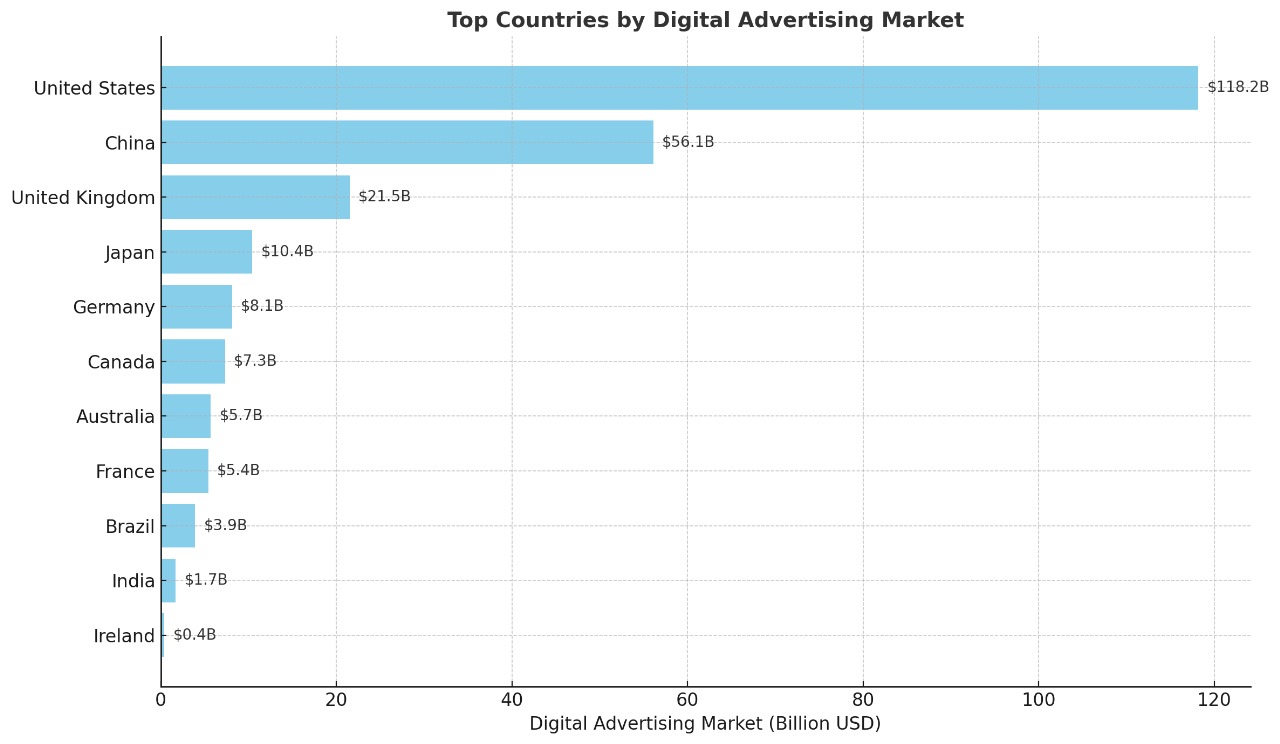 Here’s the chart showing the Digital Advertising Market by Country. Each bar represents the market size in billions of USD, with values labeled for quick reference.
